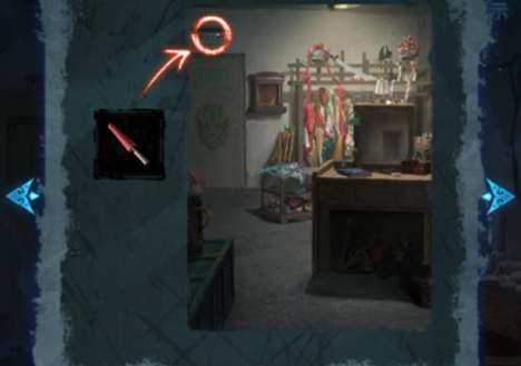 7、将获得的绣花鞋放到墓碑前的火盆中打开密室,在梳妆台上获得一张封条,使用纸伞将上方的电闸打开。