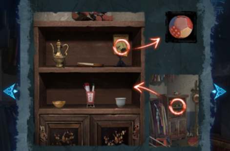 12、将布娃娃摆到后台的神龛上后获得新的线索,按线索将仓库陈列架上的戏曲道具如图摆放,可以获得玩具球。