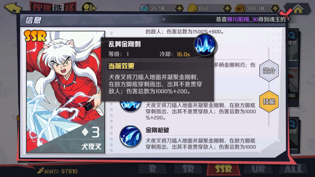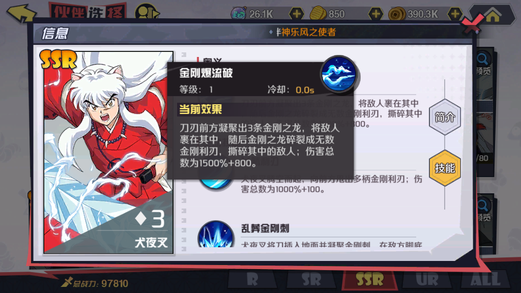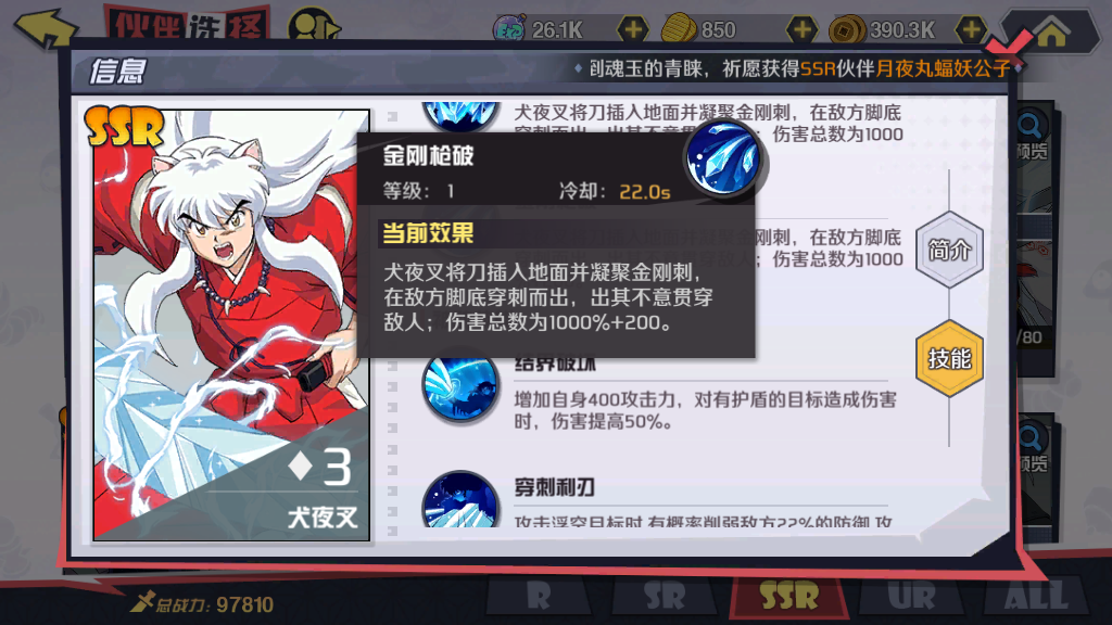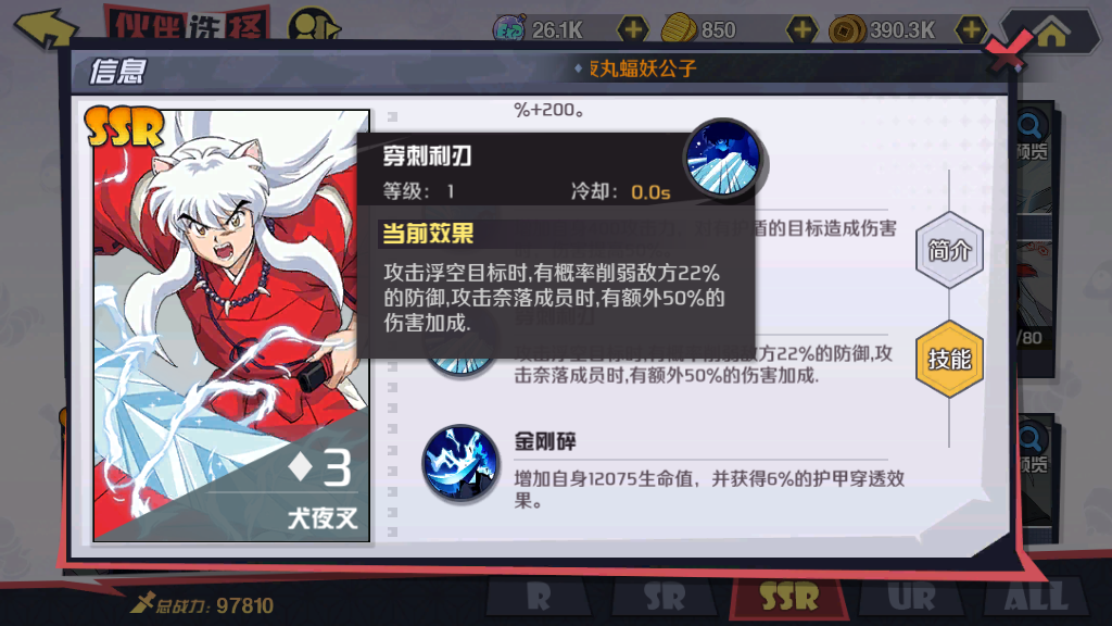 SSR的犬夜叉与其他级别犬夜叉,最大的区别就在于进攻能力。SSR更趋向于突进型,在战斗当中可以对敌人前排造成致命的伤害。尤其是“飞腾利刃”技能,在腾空的状态下,释放出多段飞刃伤害,对敌人可以造成1000%的物理损伤。该技能适合秒杀掉各大副本当中的小妖怪。