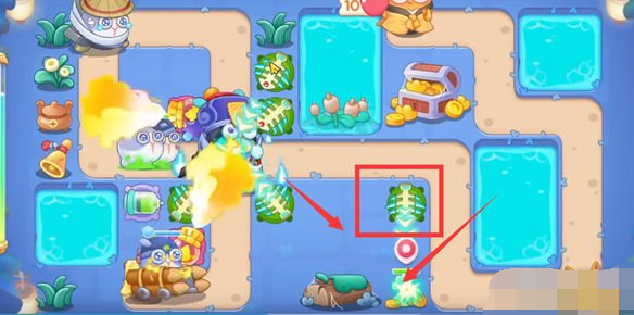 1、首先我们开局在如图所示位置放鱼骨刺,用鱼骨刺拆附近道具。