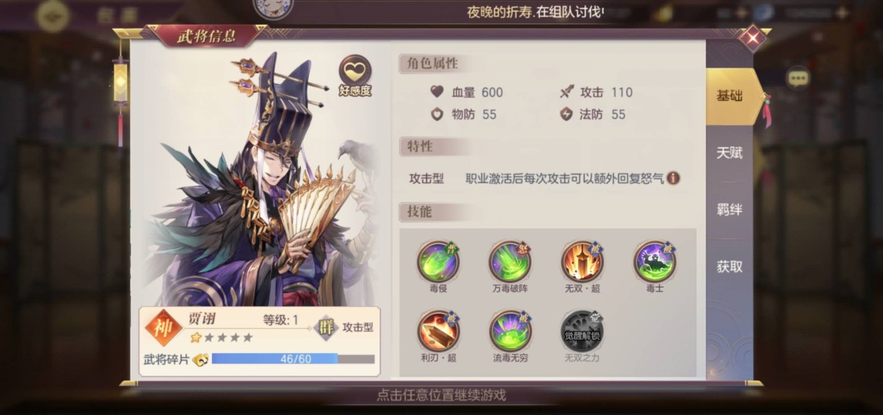 首先贾诩是一个攻击型武将,所以可以看出他是一个输出型武将。他的普通攻击会攻击敌方单体并使敌方受到中毒的效果,并且对方中毒的单位获得的怒气会减少30%,还会在回合开始的时候受到6%最大生命值得伤害。