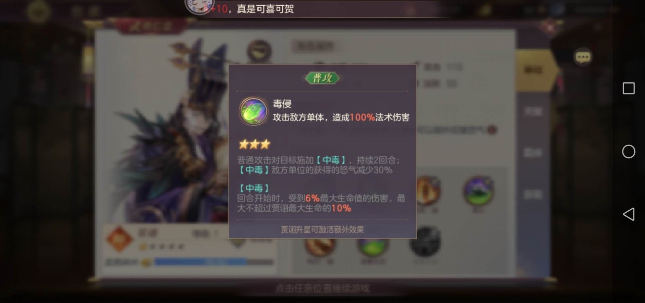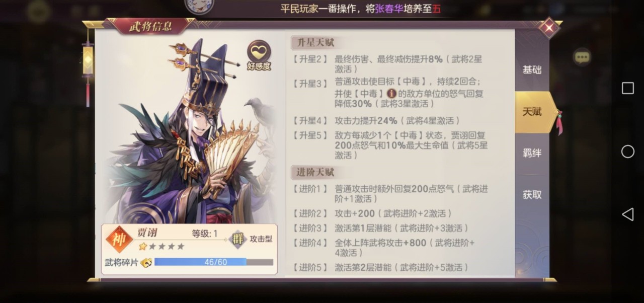 在贾诩两星时他的伤害和减伤都会得到提升,在他三星时他的普通攻击会使目标中毒,在四星是会提升自身四分之一的攻击力,在他五星时会得到一个额外的效果,对方武将每减少一个中毒状态贾诩会恢复一定的怒气和生命值,在贾诩无双时他会使所有的中毒效果造成的伤害上升四分之一,并且最高可以上升一半。