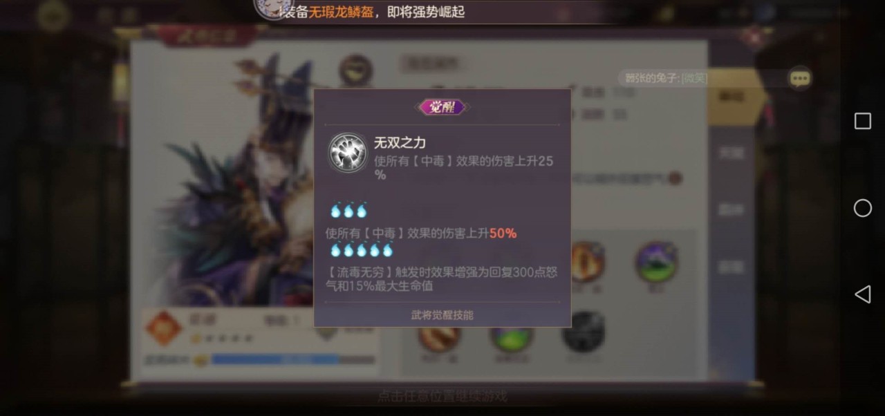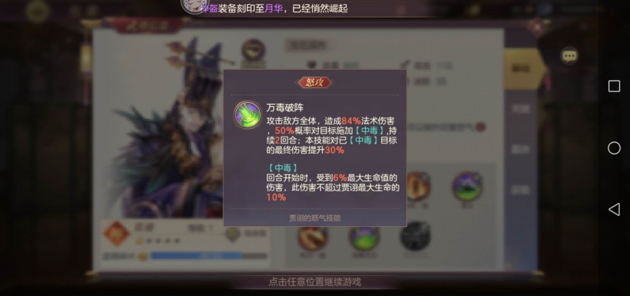 他的技能会对敌方所有人造成84%的法术伤害,并且有一半的概率对目标施加上中毒的负面效果,这个中毒效果会持续两个回合,这个技能还会对已经施加了中毒效果的武将造成比其他武将多30%的最终伤害。
