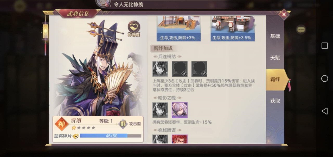 贾诩的羁绊分为和张春华,典韦,张角,张郃组成的被动羁绊,这个被动羁绊可以增加贾诩的生命,攻击,物理防御和法术防御。在贾诩与三名同样是攻击武将上阵时,贾诩他自身造成的所有伤害会提升15%,并且我方所有攻击型武将提升一半的怒气降低抗性和一半的异常状态抗性,持续三回合,因为一场战斗在前期非常重要,所以贾诩这个羁绊可以说是十分强力了。