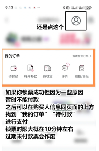 8. 如果你锁票成功但因为一些原因暂时不能付款,之后可以在购买人信息同页面的上方找到 “我的订单 待付款进行支付,锁票时限大概在10分钟左右,过期未付款票会作废。