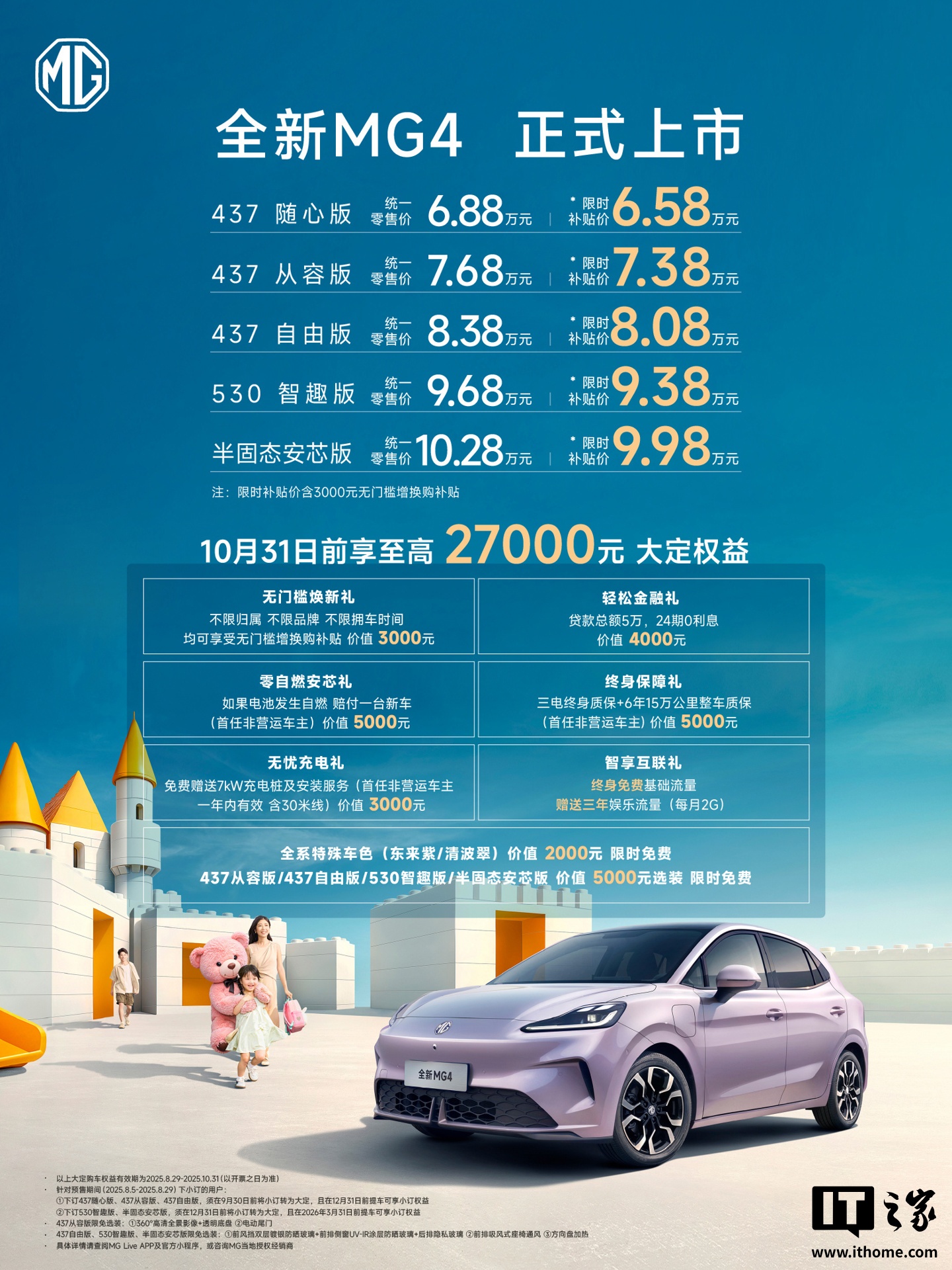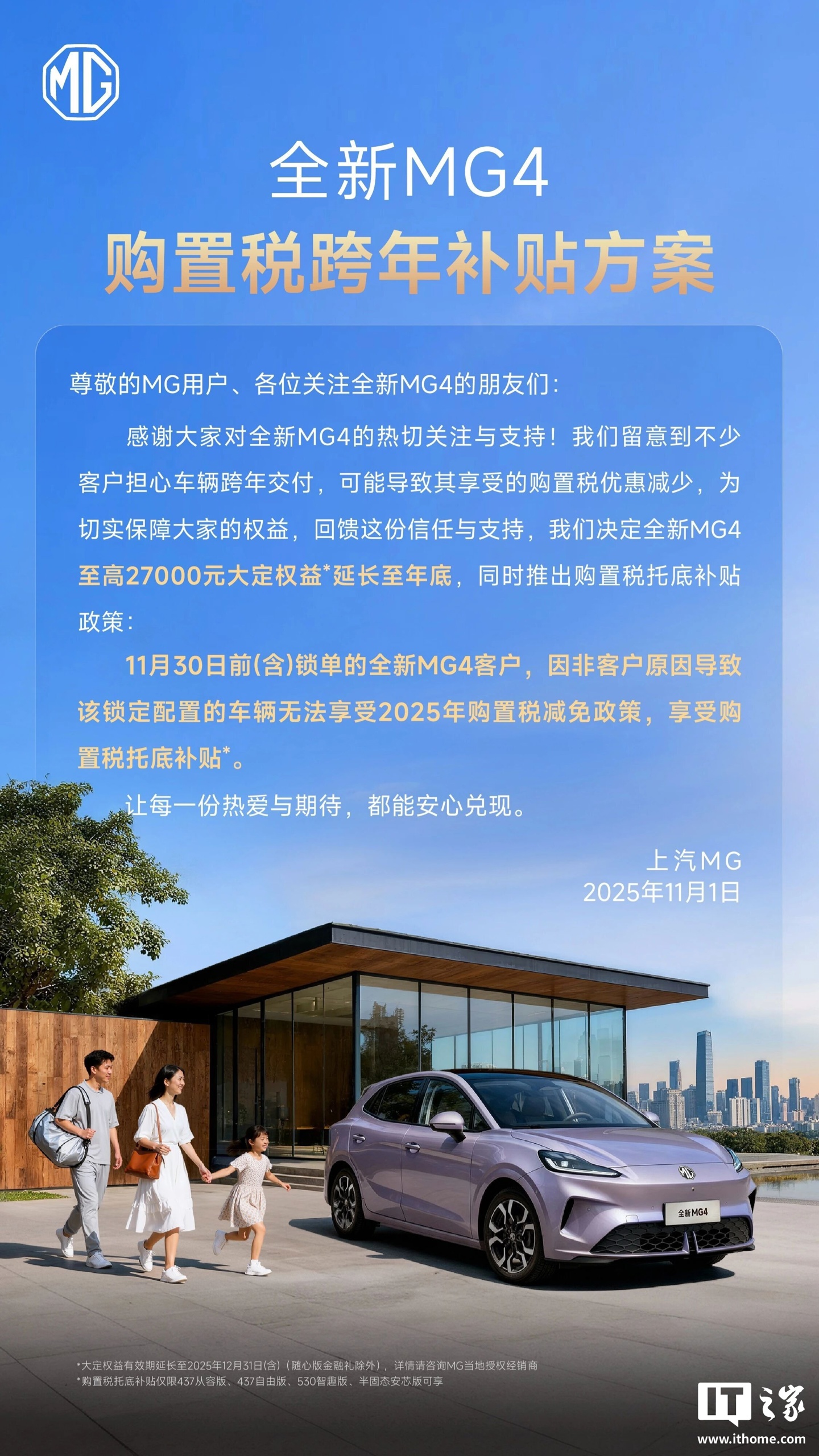 12 月 1 日消息,上汽 MG 今日宣布,全新 MG4 汽车购置税托底补贴从 11 月 30 日延至 12 月 28 日,锁单全新 MG4 437 从容版、437 自由版、530 智趣版、半固态安芯版的客户,因非客户原因导致该锁定配置的车辆无法享受 2025 年购置税减免政策,享受购置税托底补贴。