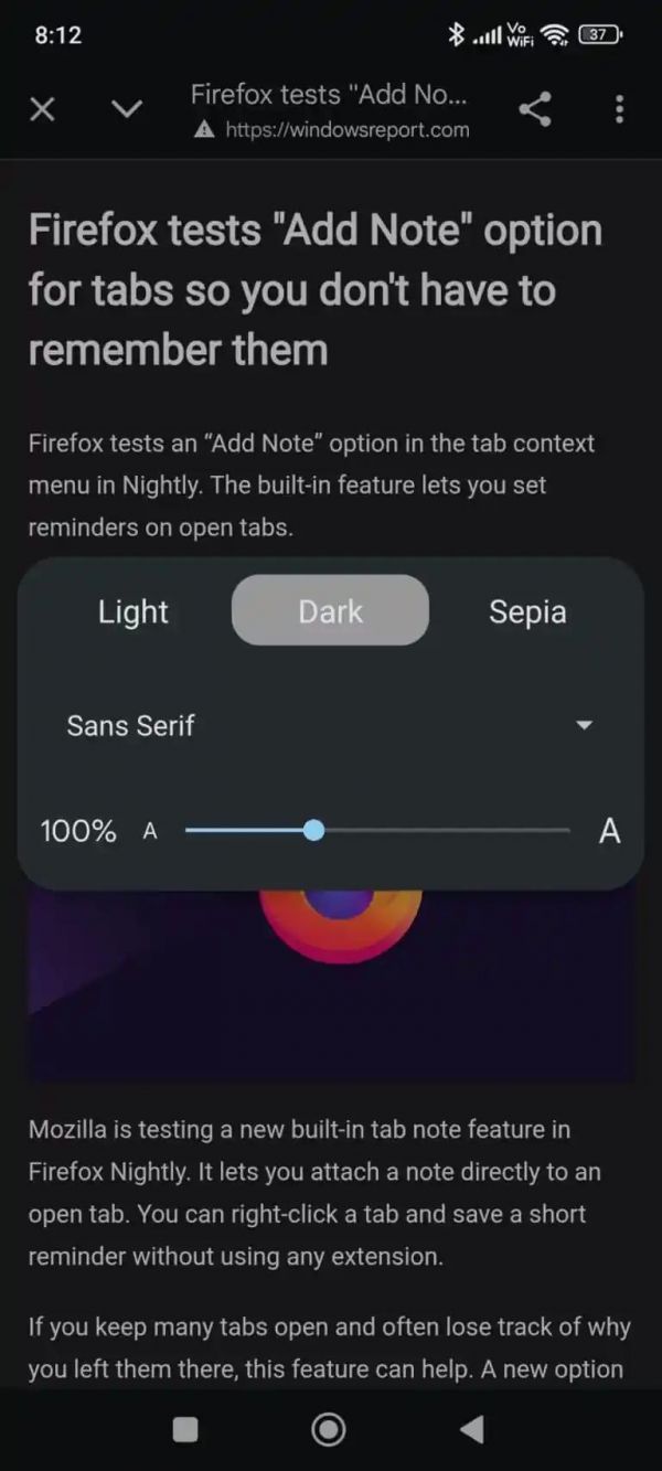 据介绍,用户可以在浏览器中打开任意网页,然后在右上角的三点菜单中选择“显示阅读模式”,然后底部会弹出一个折叠面板,展开后就能看到自定义选项。