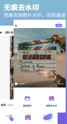 支持添加文字、图片或视频水印,并可叠加照片。