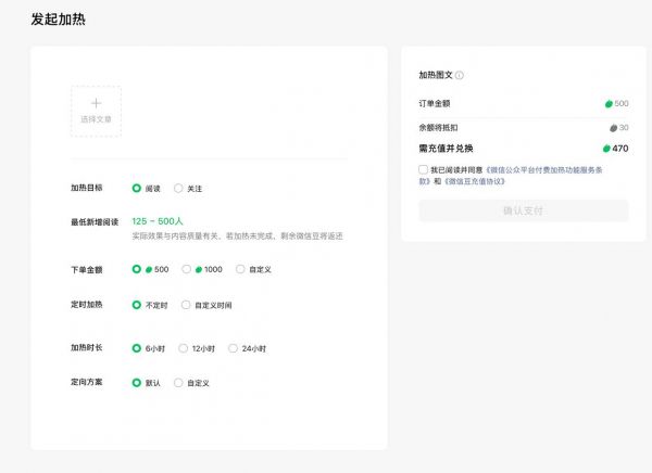 具体来看,“付费加热”功能可以选择提升阅读量或者增加新关注。这一功能需要付费,通过微信豆的方式购买。例如,500个微信豆,可以选择新增阅读125-500人。据悉,1元可以购买10个微信豆,按此估算,新增一个阅读大概需要0.1-0.4元。