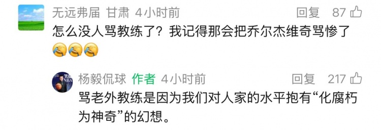 对此杨毅侃球公众号回复:“骂老外教练是因为我们对人家的水平抱有‘化腐朽为神奇’的幻想。”