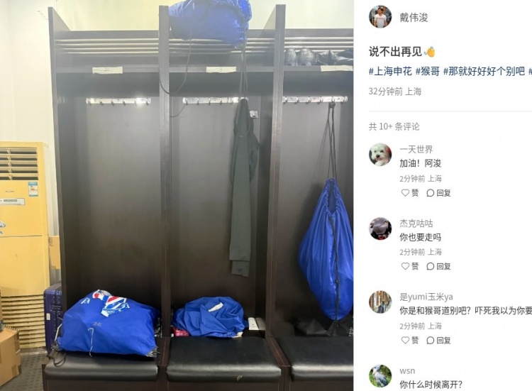 戴伟浚在社媒晒出了训练结束后更衣室的照片,他在更衣室的座位正好紧挨着于汉超的位置,看着于汉超打包好的衣物,因此他非常感慨地配文“说不出再见”。