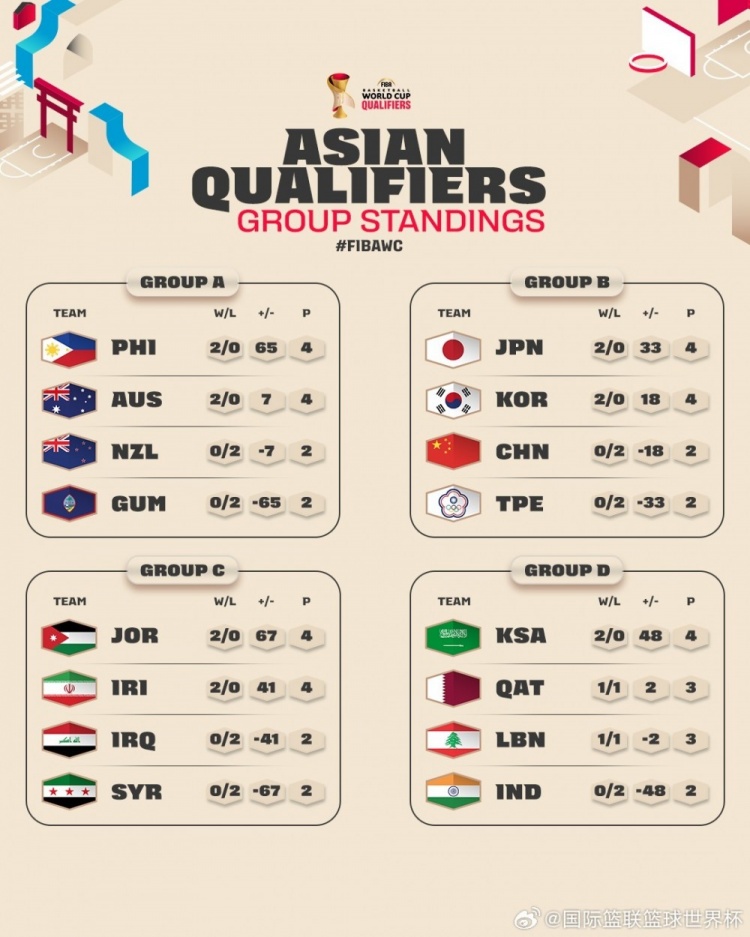 亚洲区预选赛中,中国队连败韩国队,目前以小分优势领先同样连败的中国台北,位列小组第三。菲律宾、澳大利亚、日本、韩国、约旦、伊朗和沙特均保持连胜。