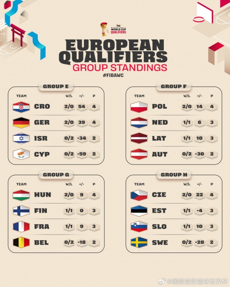 直播吧12月3日讯 世预赛第一窗口期结束,四大赛区积分榜出炉。