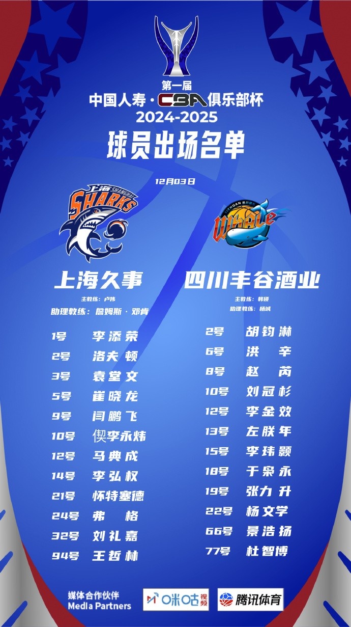 东方体育日报记者薛思佳在社媒上晒出了两队本场比赛的大名单,张镇麟、古德温今天不打,四川男篮全华班出战。