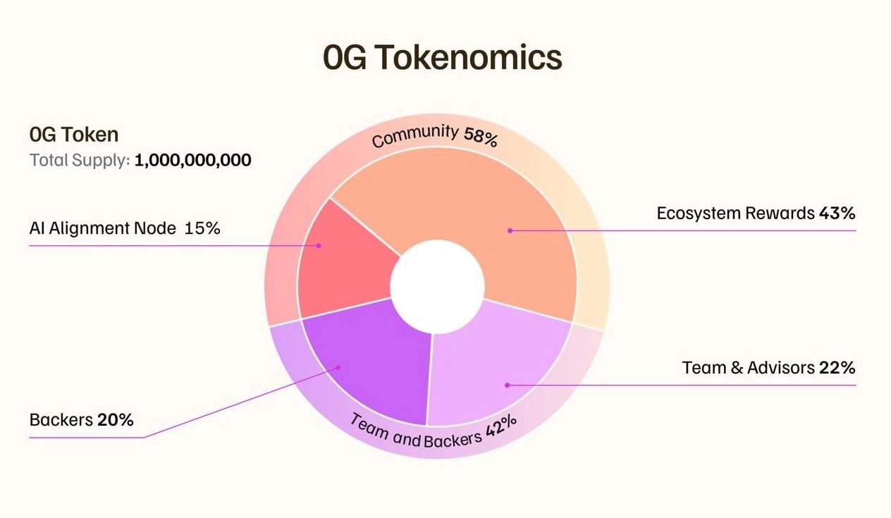 0G代币总量10亿枚,分配比例中社区激励占比58%,团队与投资者占42%。代币用于网络运营、质押及交易费用支付,通胀机制配合销毁调节供应。