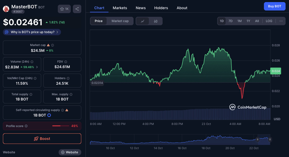 当前$BOT报价$0.025 USDT,24小时涨幅达30%,交易量突破$300万。市值$2500万位列CMC第3693名,10亿代币全流通。去中心化交易所Orca为主要交易场所,社区热议"早期机器人宝石"概念。