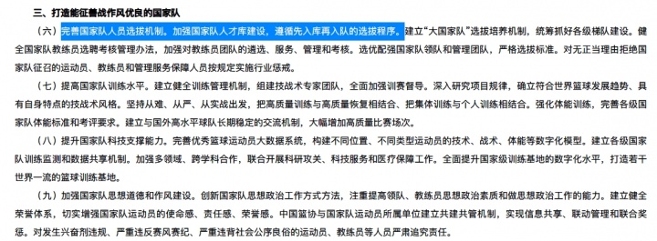 关于国家队,提到了完善国家队人员选拔机制、提高国家队训练水平、提升国家队科技支撑能力、加强国家队思想道德和作风建设四点。