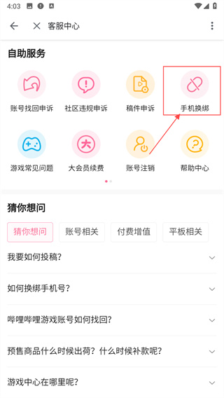 3、在客服中心页面右上角找到并点击“手机换绑”选项。