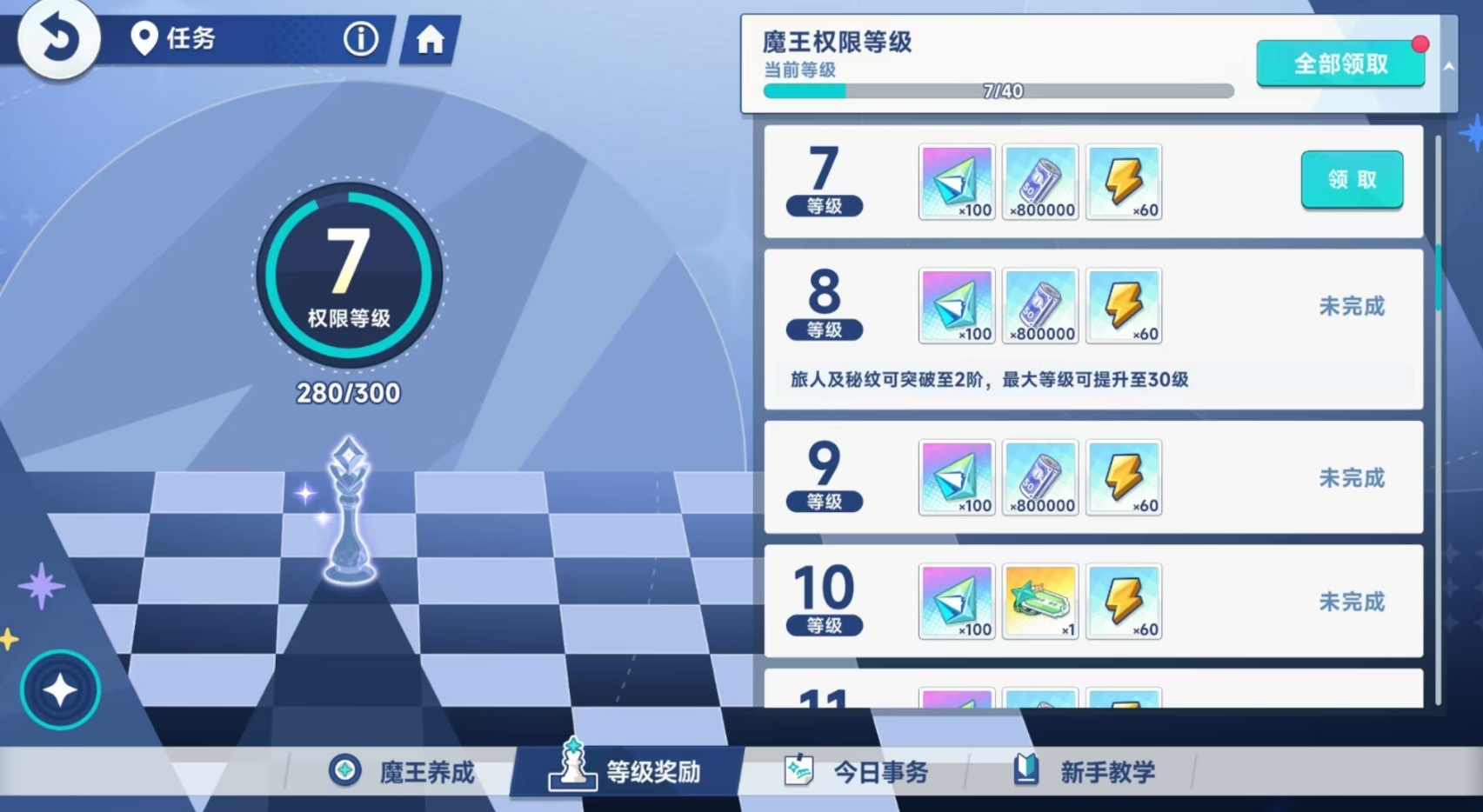第三种途径是通过“魔王养成”界面来完成章节任务。这种系统设有多个章节的任务链,任务相对简单,即使涉及战斗的部分也只需通关最低难度即可满足条件。在每个章节完成后,玩家将获得丰厚的奖励,其产出比非常高,建议优先进行这个步骤。此外,每当玩家提升权限等级时,可在等级奖励界面领取对应的回馈奖励。这些奖励包括稀有的资源如星之砂和体力药等,务必及时领取以免错过宝贵的机会。