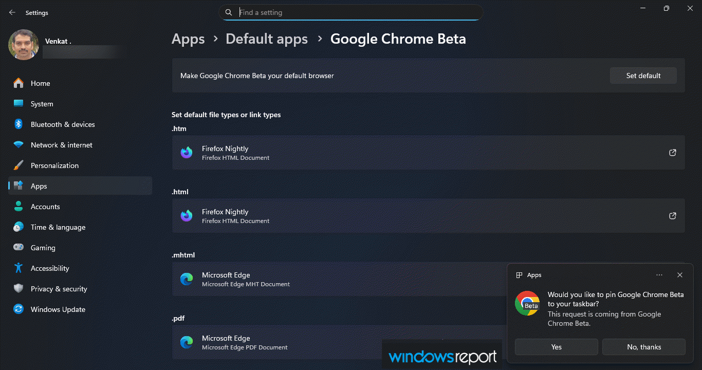 当用户点击“设为默认”后,Chrome 会打开 Windows 系统设置的默认应用界面,同时弹出通知,询问用户是否要将 Chrome 固定到任务栏上。