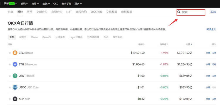 4. 登录账户后,通过顶部导航栏的【发现】-【市场】入口进入加密货币行情页面。