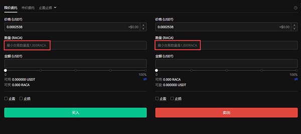 5.输入交易数量(最低1000RACA),点击买入/卖出按钮完成操作。
