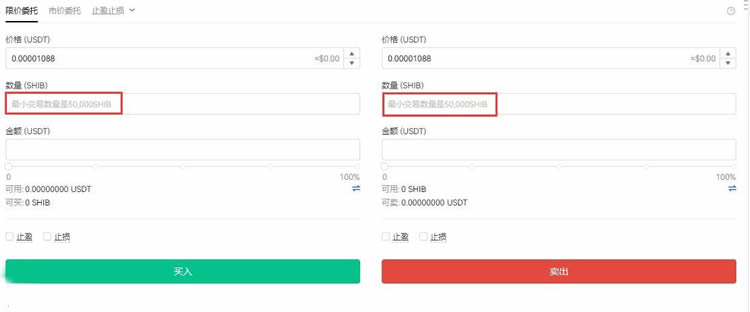 5. 填写交易数量(最低50000SHIB),执行买卖操作