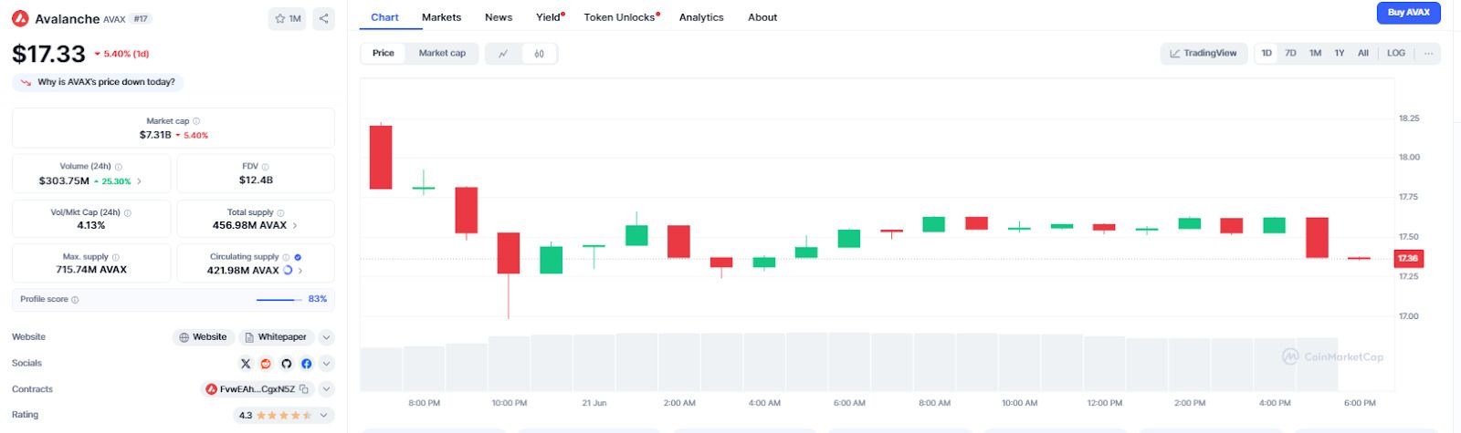 最新行情显示AVAX报价17.35美元,市值73.2亿美元位列加密货币第17位。24小时交易量达3.0268亿美元,当前流通量为4.22亿枚。值得注意的是,该代币曾在2021年创下144.96美元的历史高点,展现出较强的价格弹性。