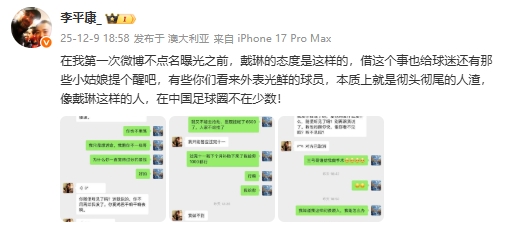 直播吧12月09日讯 李平康在社媒发文,披露了部分戴琳与债主的聊天记录,并表示戴琳这样的人在中国足球圈不在少数。