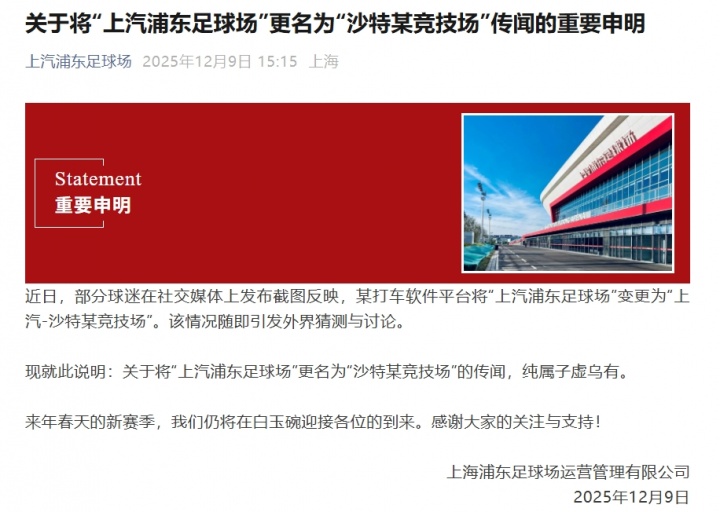 现就此说明:关于将“上汽浦东足球场”更名为“沙特某竞技场”的传闻,纯属子虚乌有。