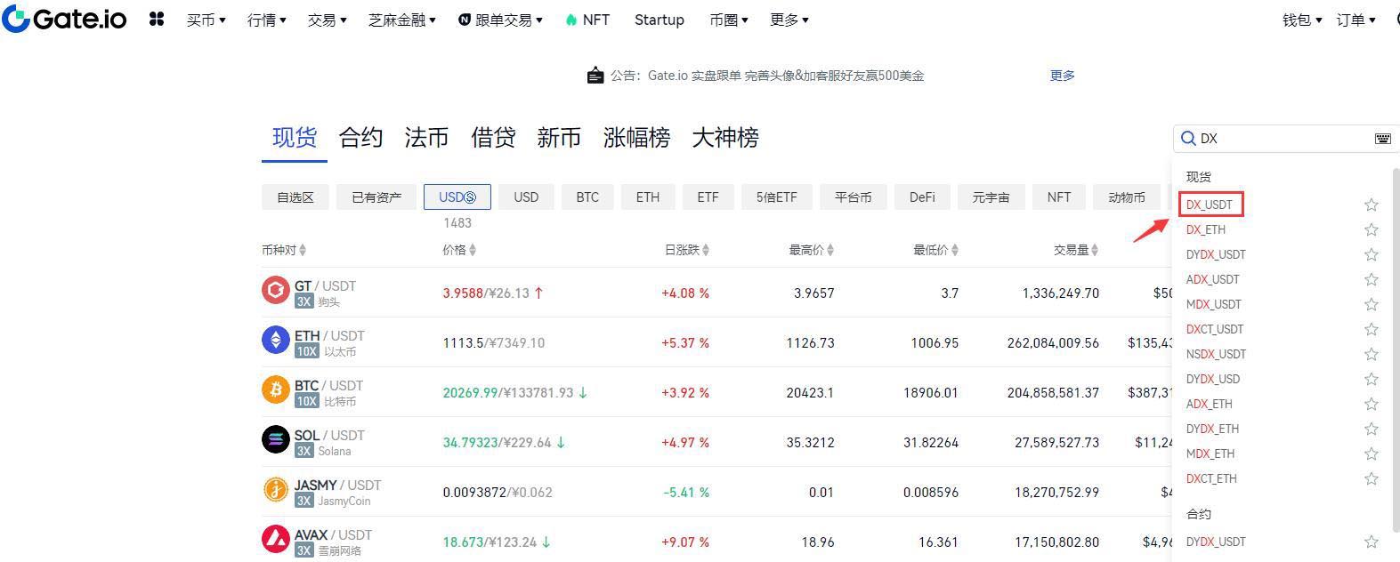 2.在搜索栏输入DxChain项目代币简称DX,快速定位交易对。