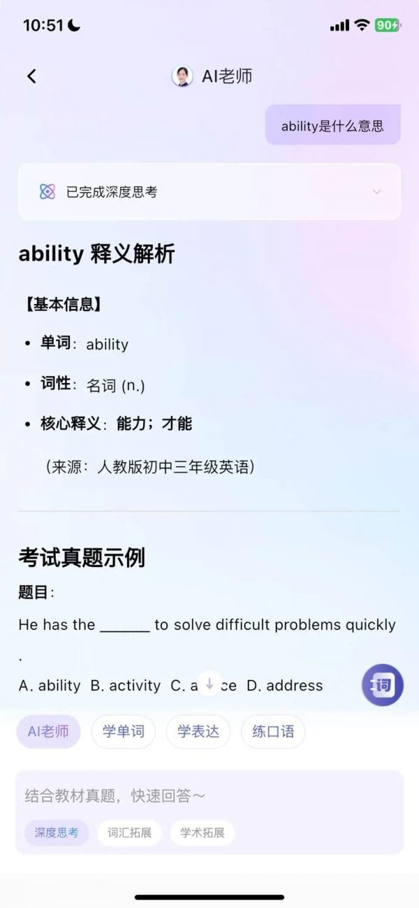 「AI教师」升级,新增百度翻译学习词典和百度翻译真题库两大组件,回答时自动识别用户学段(小学/初中/高中/职场),像老师一样“因材施教”: