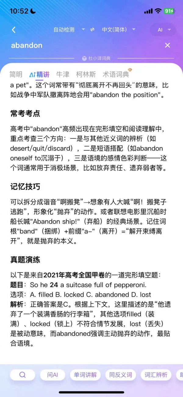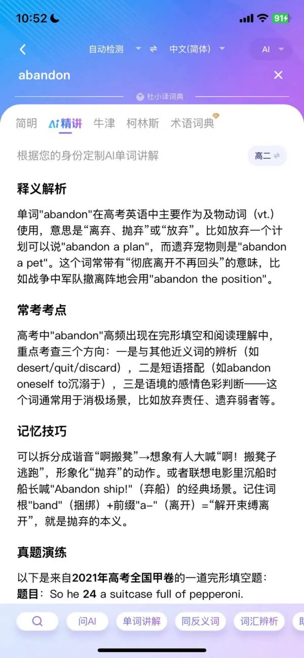 新增「AI精讲」功能,为你定制专属单词课堂。查询单词时,AI将化身私人导师,深度解析其释义、考点与记忆技巧,并提供真题巩固。讲解内容将精准匹配您的学段,确保每一条信息都切中学习要害。