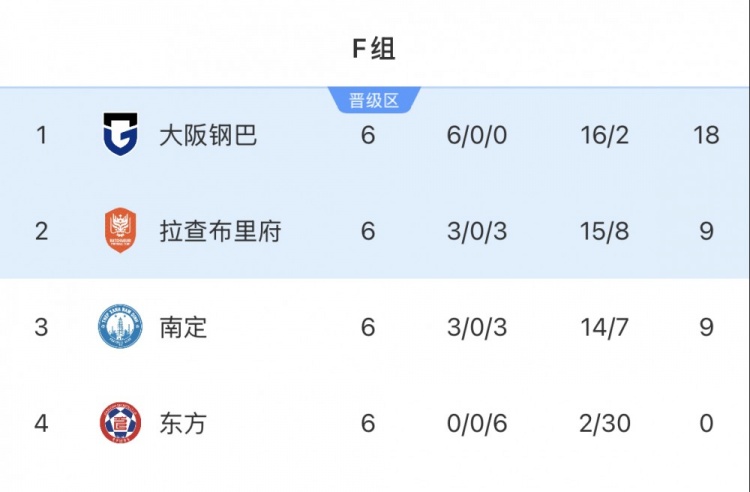 小组赛末轮,拉查布里府0-2不敌大阪钢巴,南定则9-0大胜东方,两队净胜球同为7个,不过拉查布里府打进15球,南定打进14球,最终拉查布里府第二出线。