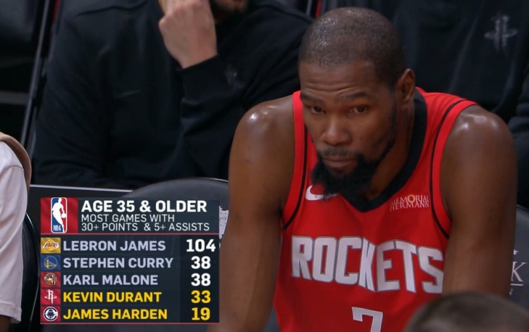 35岁+砍至少30分5助场数:老詹断档第1 库里马龙第2 KD第4哈登第5