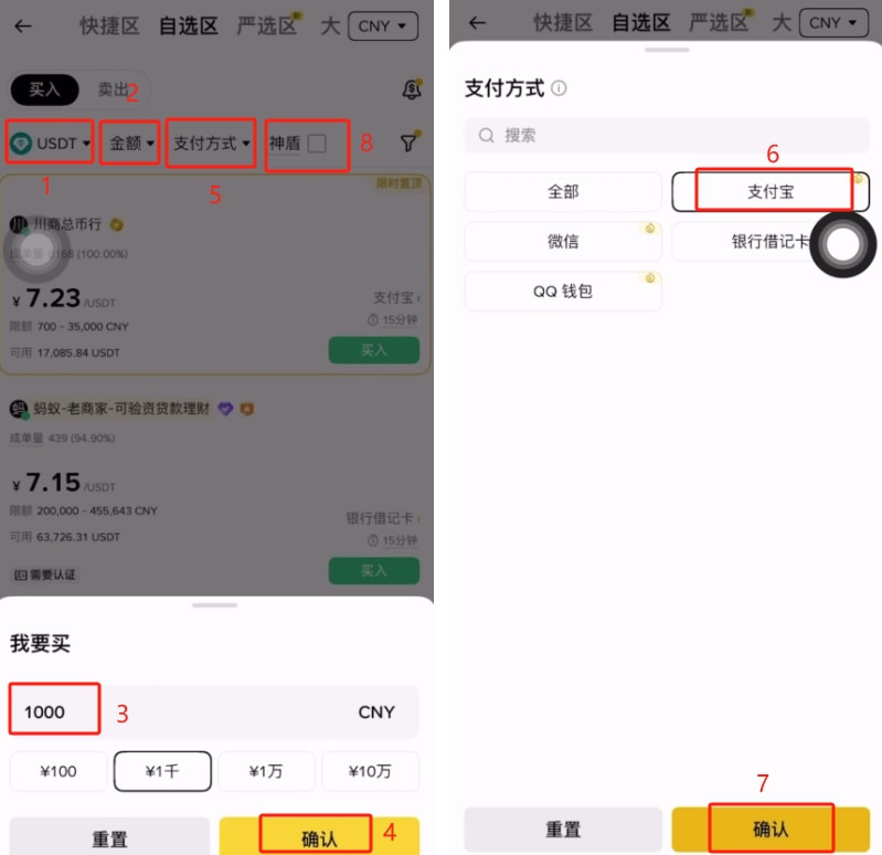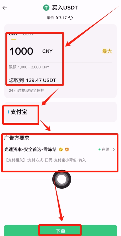3、选择购买USDT并输入金额(如1000),支付方式勾选支付宝,务必选择神盾商家保障安全。