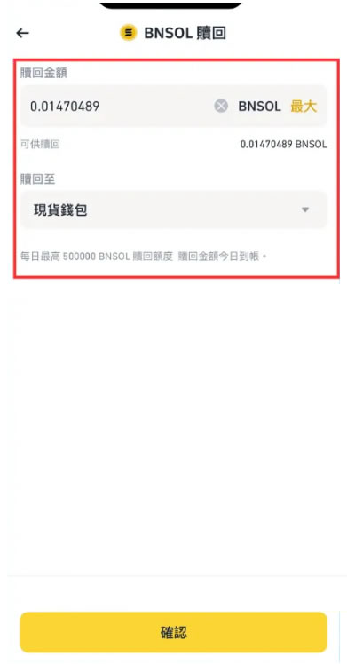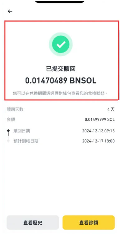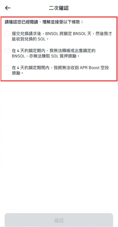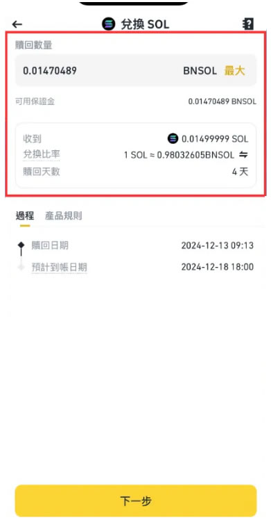 赎回SOL需归还对应BNSOL,处理周期为4个工作日。期间仍可继续获得收益。
