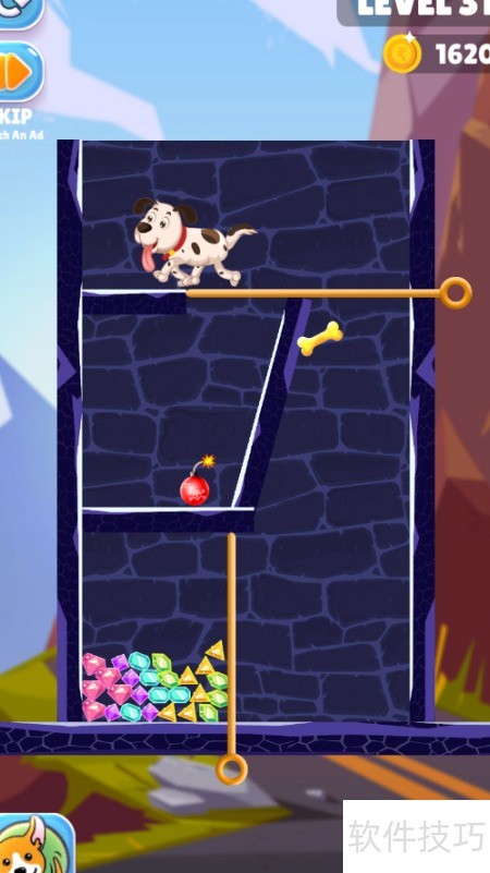 - 斑点狗在关卡顶部移动,需抵达底部获取宝藏,具体情形见示意图。