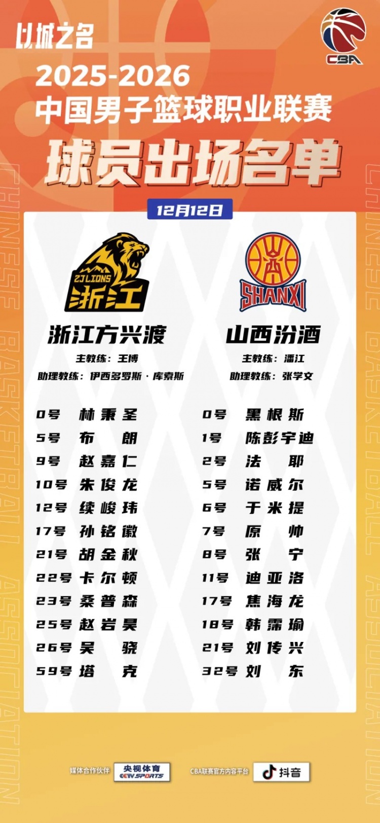 直播吧12月12日讯 19点35分,新赛季CBA常规赛揭幕战广厦对阵陕西的比赛将开打,赛前官方公布了本场比赛两队的大名单。具体如下: