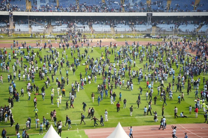 据印度媒体报道,由于赛事组织方的管理混乱和安全漏洞问题,梅西不得不提前结束绕场,球迷对当地官员发出嘘声、丢水瓶,最终大批球迷冲进场内对体育场进行破坏。