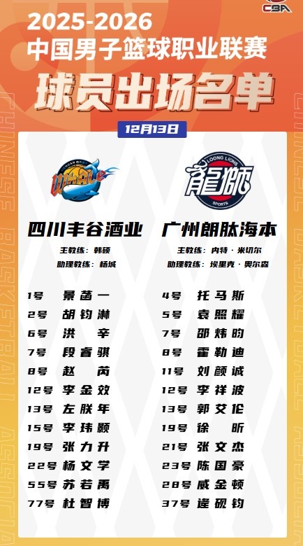 直播吧12月13日讯 今晚19点35,四川男篮将在主场迎战广州男篮,双方大名单如下: