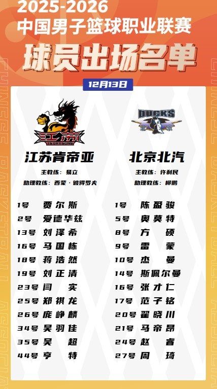 直播吧12月13日讯 今晚19点35,江苏将在主场迎战北京,双方大名单如下: