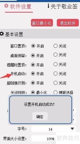 二、在软件设置中找到并开启开机自启功能,便可确保你的敬业便签在你启动电脑时自动运行,为你提供即时的提醒服务。