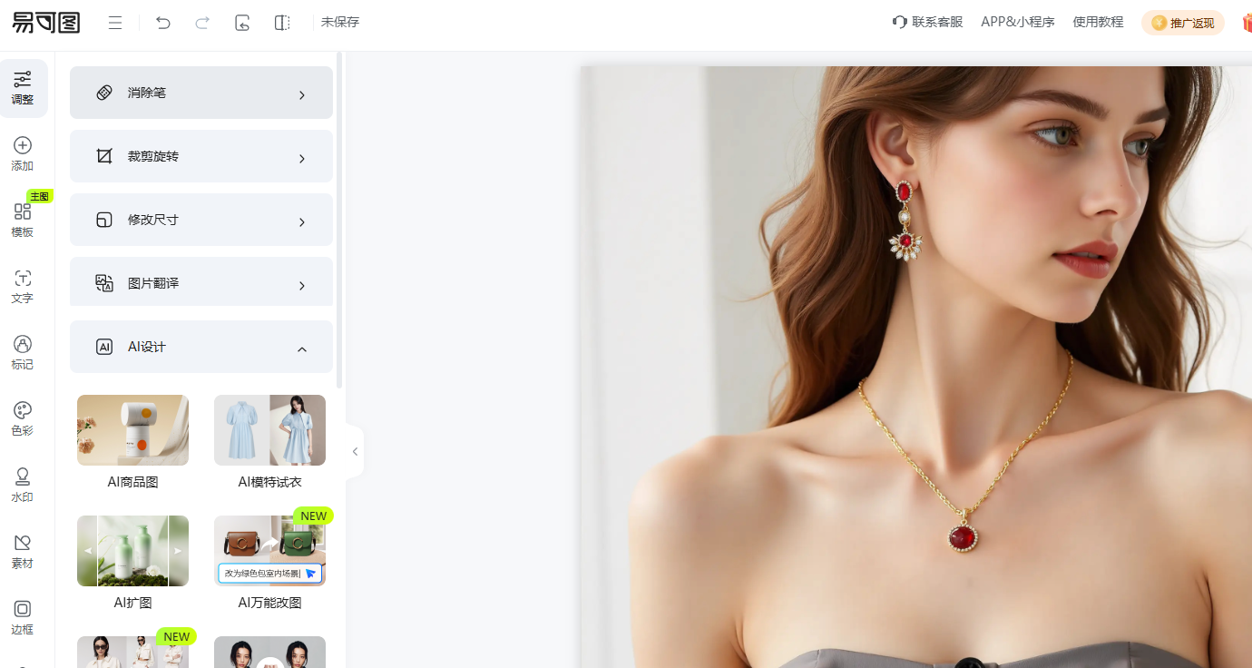 2. 选择所需功能:根据自己的需求点击相应的功能按钮,比如“图片编辑器”、“AI模特试衣”、“AI万能改图”。