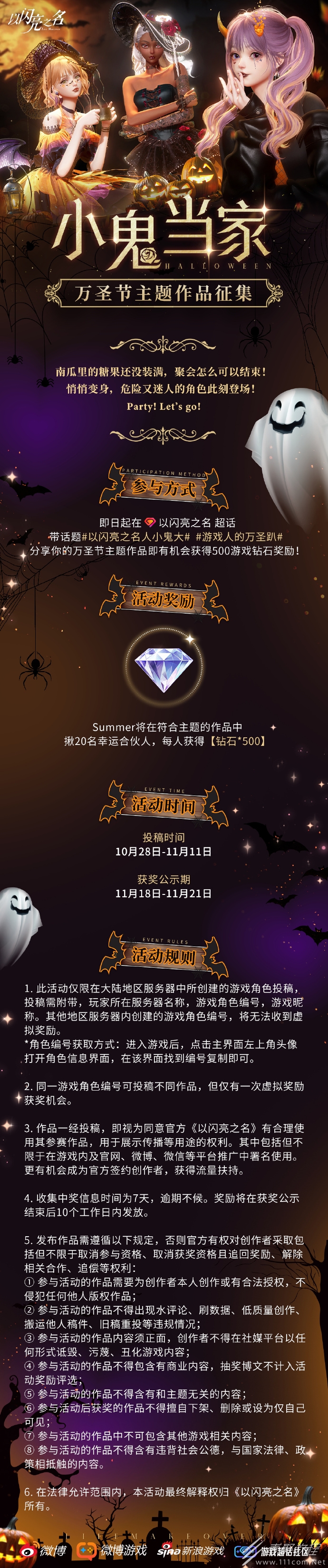 halo!各位合伙人,灯光会场已就位,就在此时,焦点由你主宰!即日起至11月14日在以闪亮之名超话 带话题#以闪亮之名人小鬼大# #游戏人的万圣趴# 发布你的万圣节主题穿搭、染色、家园建造等作品,图片、视频形式不限,即有机会获得500钻石好礼。